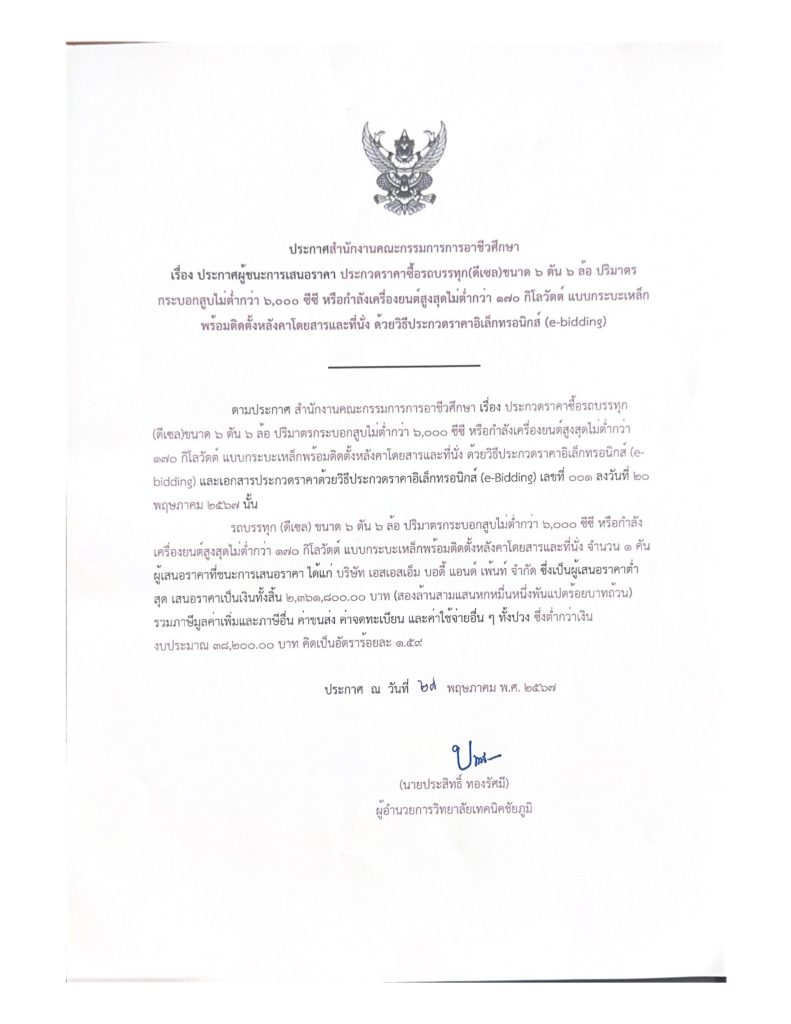 ประกาศผู้เสนอราคา ประกวดราคาซื้อรถบรรทุก(ดีเซล)ขนาด6 ตัน 6 ล้อ