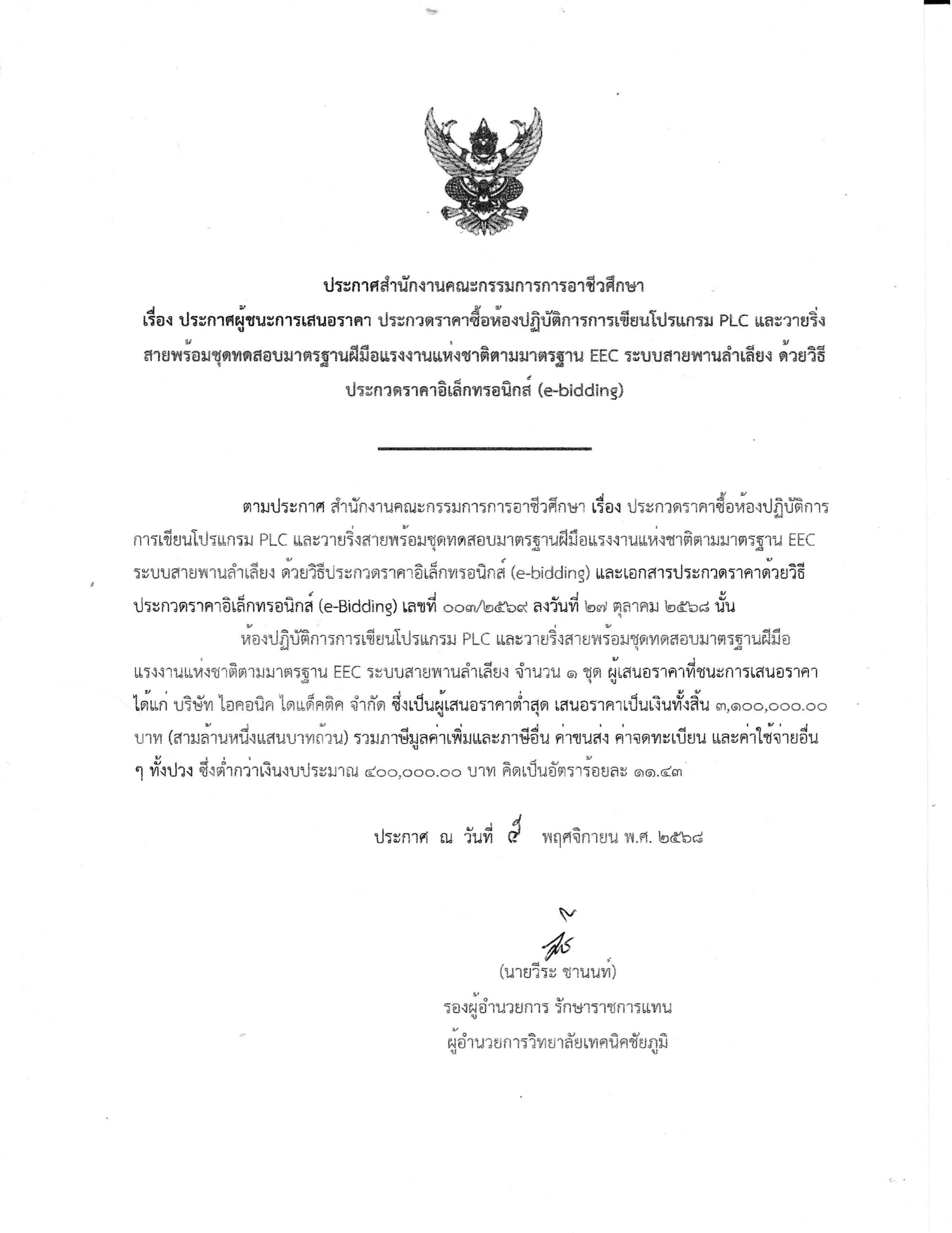 ประกาศผู้ชนะการเสนอราคาประกวดราคาซื้อห้องปฏิบัติการการเขียนโปรแกรม PLC และวายริ่งสาย 6 พฤศจิกายน 2025